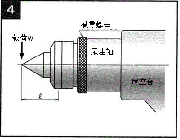 d. 为了解决前端的“挠曲”所产生的加工振纹和加工进度的“偏差”现象,使用“减震螺母”来支撑尾座轴的前端和旋转中心的头部之间的“间隙”使其一体化,阻止了“挠曲”的产生。据此,尾座轴端面到支点的距离可以缩减至,由移动至旋转中心头部之前所得的距离。由此可抑制前端所加载的载荷力矩,得到与固定中心相当的刚度。