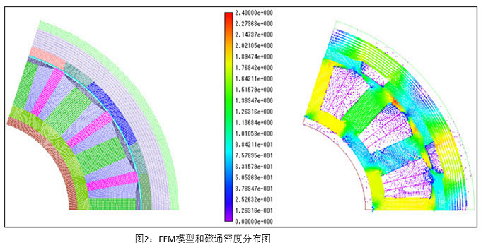 为确认大多数参数的影响,构筑一个可能实施自动解析的系统,该系统从做出一个主要尺寸和各部件的表格开始,再做成FEM模型,然后到输入条件并实行解析,来提高设计的效率。自动生成的FEM模型的磁通密度分布图如图2所示。