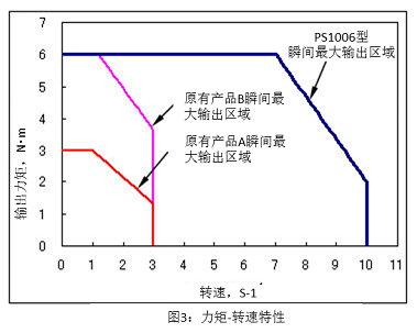 与原有产品A和B进行比较,最大输出力矩增大2倍,同时,高速范围内的摩擦力矩特性有了大幅的改善。